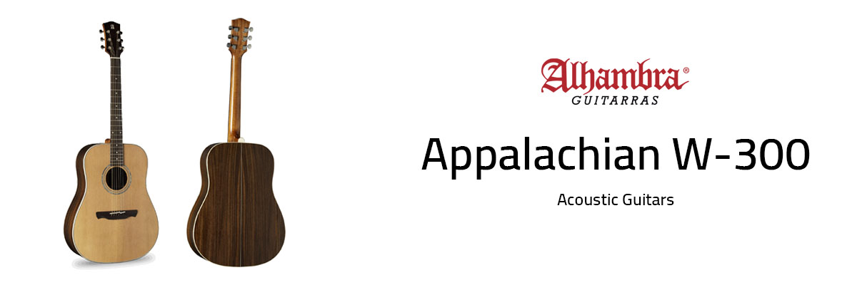 ppalachian W300 acoustic guitar by Alhambra. Made in Spain by Alhambra Guitars, Appalachian acoustic guitars have great quality / price ratio. Built with quality materials, their sound is far superior to its price. Another distinguishing features of these guitars is their comfortable action. Available with or without cutaway and electrified as an option.