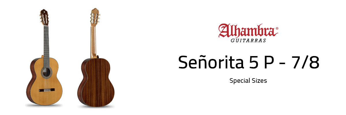 The Alhambra Senorita 5P - 7/8 from Alhambra Guitars. Special size Classical Guitar. The soundboard – major influence on the guitar’s sound consists of a thin piece of softwood that is supported by 7 braces, 2 harmonic bars at the bottom will enhance a full-bodied, warm and rich sound.