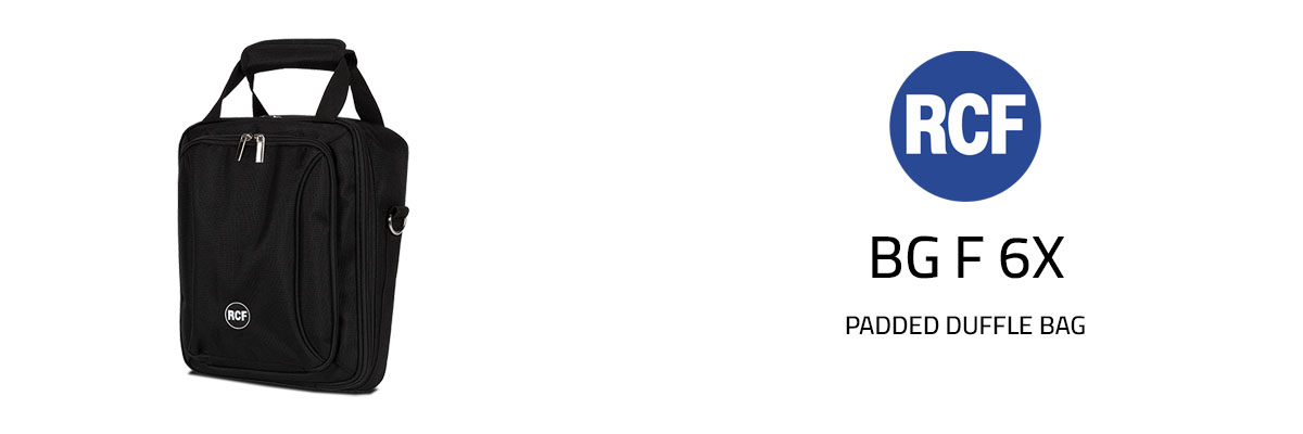 Super User BG F 6X Padded duffle bag for mixers RCF F 6X with handle and shoulder carrying strap. Wide front pocket with separated compartment for tablet computers or other accessories.