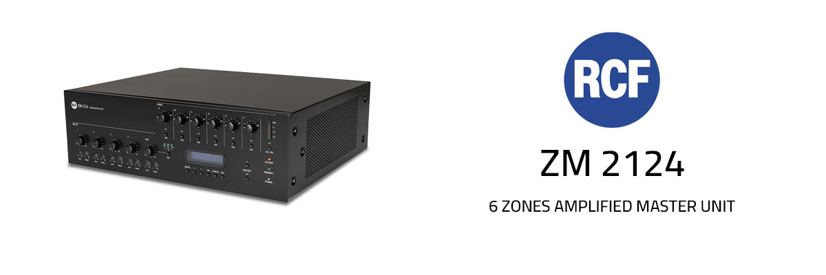 ZM 2124 is the ZM 2000 system master unit that includes a preamplifier with 6 zones selection and a built-in 240 W amplifier. It is based on a dual bus architecture, where the first bus is mainly dedicated for selective / all-call paging, while the second bus is for music distribution (or other signals). Toggle buttons turn on / off the second bus (music) on each zone and logic inputs / outputs (GPI / GPO) are available to interface the system with other devices. ZM 2124 is mostly indicated for small systems, where the required power for each zone is limited.