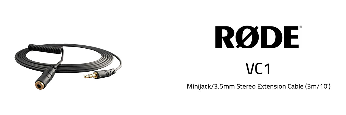 The VC1 is a 3m (10') 3.5 mm stereo audio extension cable, featuring two core shielding and a gold plated jack and socket. It is ideal for use to connect a RØDE VideoMic, Stereo VideoMic or VideoMic Pro when the microphone is mounted on a boompole, or away from the camera or recorder. The VC1 can also be used as a high quality headphone extension cable.