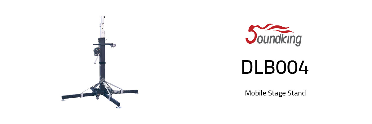 Mobile stage stand, recommended load capacity of 180kg. Height Adjustable: 1.77 to 5.50m and Folded Position: 1.77m